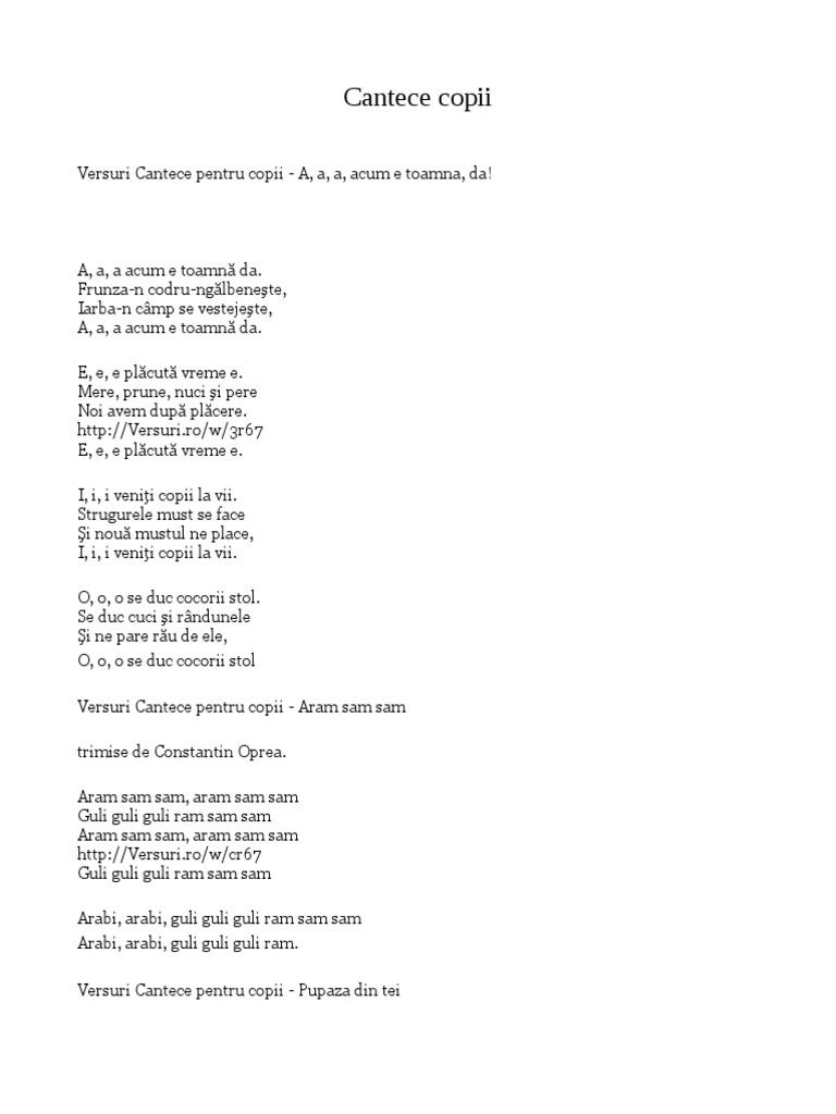 vizitati articolul complet aici : http://www.citatepedia.ro/index.php?id=95508 Haideţi să învăţăm împreună versurile şi cântecul acum e toamnă, da. E e e plăcută vreme e mere prune nuci și pere, noi avem după plăcere e e e plăcută vreme e. E, e, e plăcută vreme e.