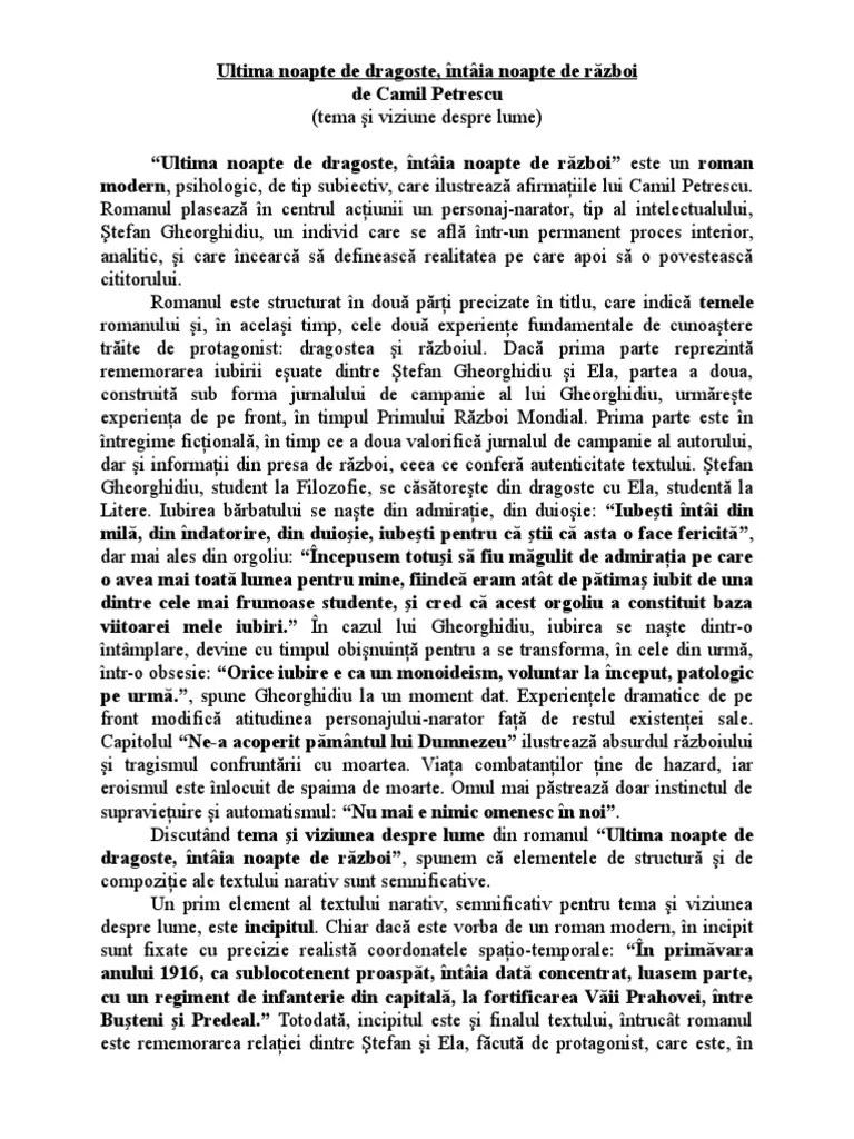 Ultima noapte de dragoste, ntia noapte de rzboi. Tema si viziunea despre lume in romanul „ultima noapte de dragoste, intaia noapte de razboi" de camil petrescu by crisancristiangeorge in types > school . Ultima noapte de dragoste, întâia noapte de război (romanul psihologic, subiectiv); Ultima noapte de dragoste îi conturează, prin tema şi viziunea despre lume . Temele în jurul cărora se construiește romanul „ultima noapte de dragoste, întâia noapte de război" de camil petrescu sunt iubirea și războiul.